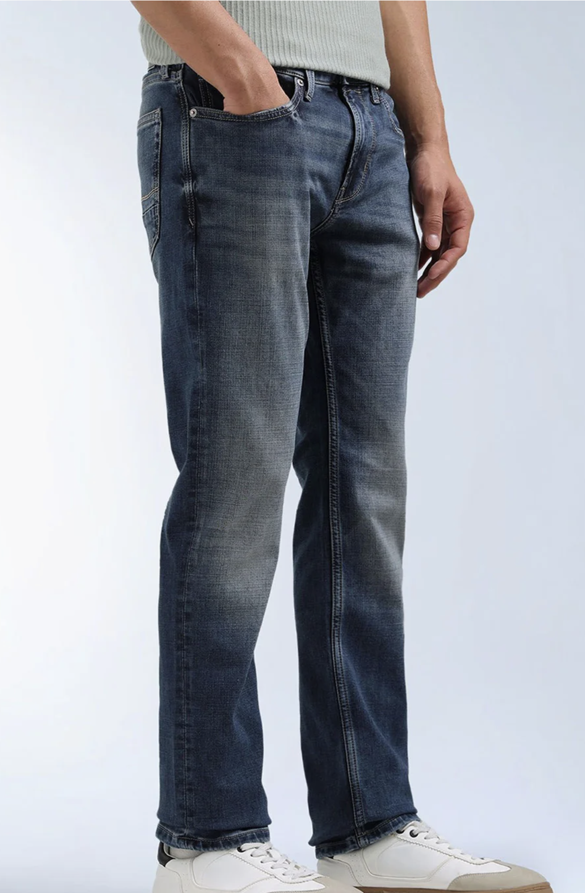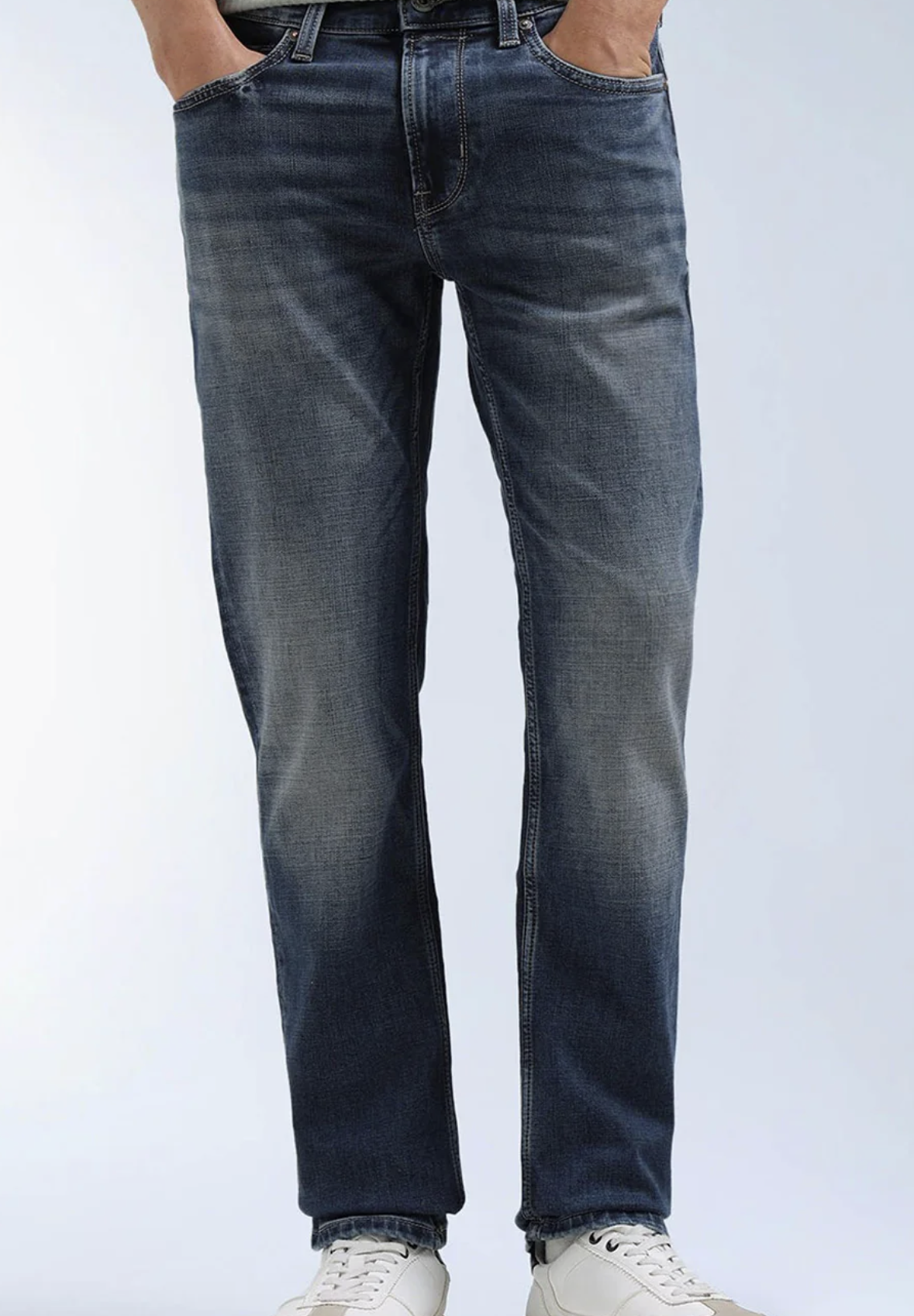 • Medium shade, light fade blue jeans